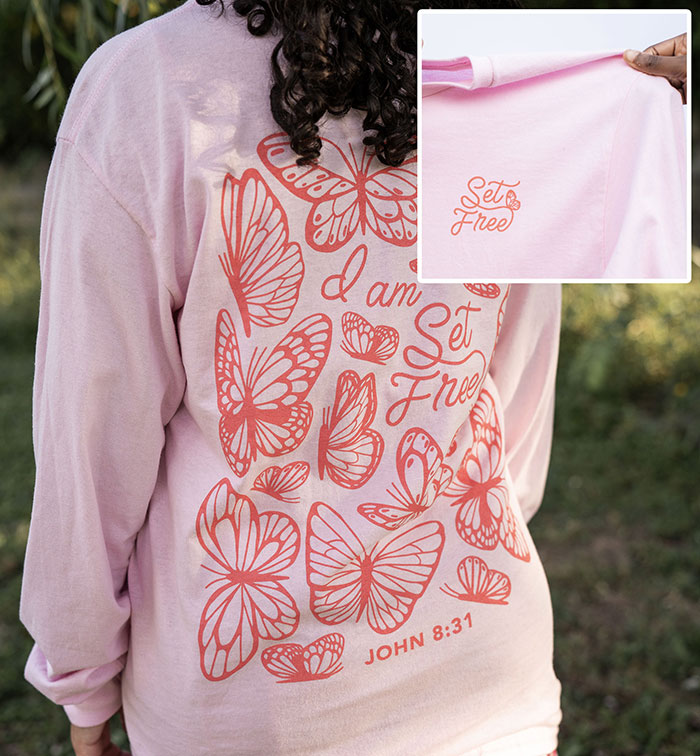 Heavyweight 100% cotton long-sleeve tee. Light pink with dark pink Set Free artwork on left chest; butterflies and John 8:32 fill the back.