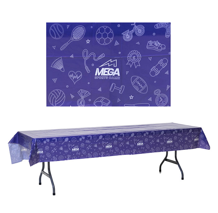 Place these disposable table covers on your registration and snack tables to help decorate your space and keep the tables clean. Blue with the MEGA Sports Camp logo. 58" x 108"