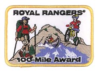 Awarded to Rangers who complete a 100-mile bike ride, hike, or canoe trip. Worn on denim awards vest. Embroidered. 2 3/4 x 4"