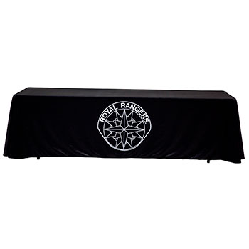 Add some pomp and circumstance to your Royal Rangers events and ceremonies with this official table cover, featuring the emblem in white against a black background. Also great for promotional displays. Fits 8' table. 100% polyester.