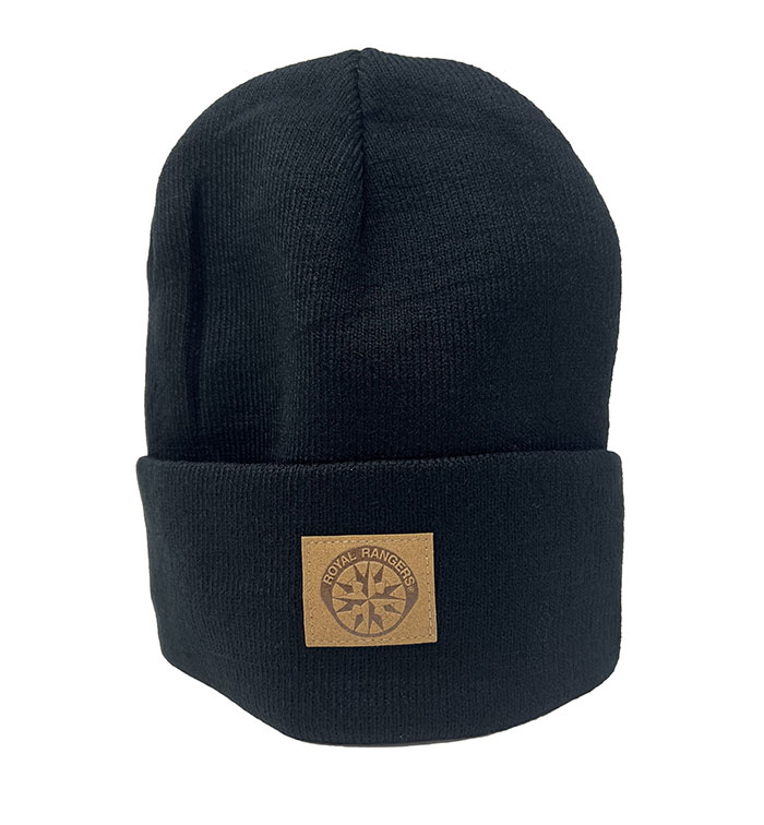 A black beanie with a cuffed design that can be adjusted to fit your needs, providing both warmth and